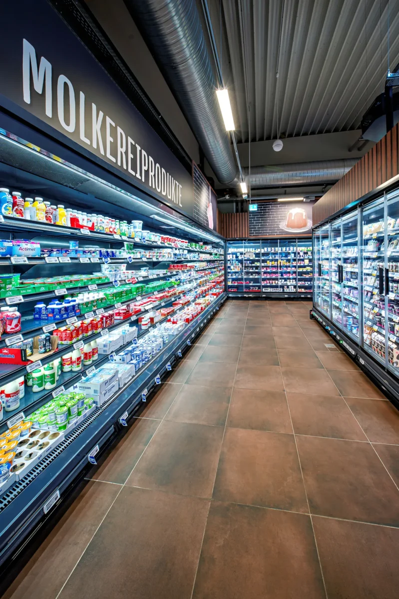 In addition, AHT supplied the new BOREA refrigeration racks and integrated a heat recovery system, which was combined with DAIKIN Altherma heat pumps to fully comply with REWE’s building requirements. For refrigeration, the system runs on R290 (propane), while the heat pump uses R32 refrigerant.